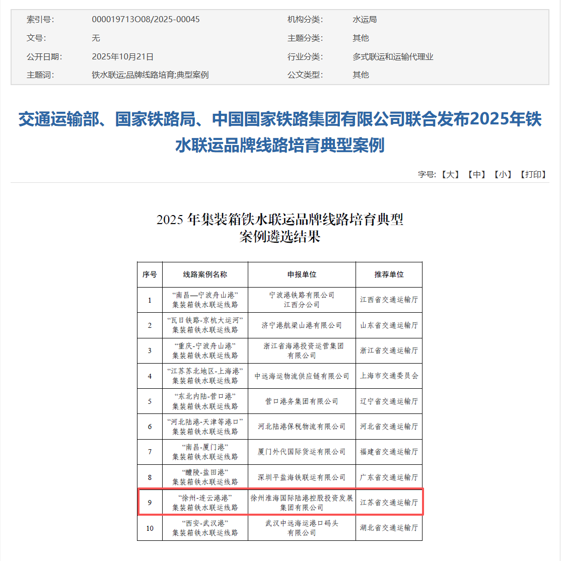 近日,交通運(yùn)輸部、國(guó)家鐵路局、中國(guó)國(guó)家鐵路集團(tuán)有限公司聯(lián)合發(fā)布2025年鐵水聯(lián)運(yùn)品牌線路培育典型案例名單,徐州陸港集團(tuán)申報(bào)的“徐州—連云港港”集裝箱鐵水聯(lián)運(yùn)線路成功入選,標(biāo)志著徐州在國(guó)家多式聯(lián)運(yùn)體系建設(shè)和區(qū)域物流樞紐能級(jí)提升方面實(shí)現(xiàn)重大突破。